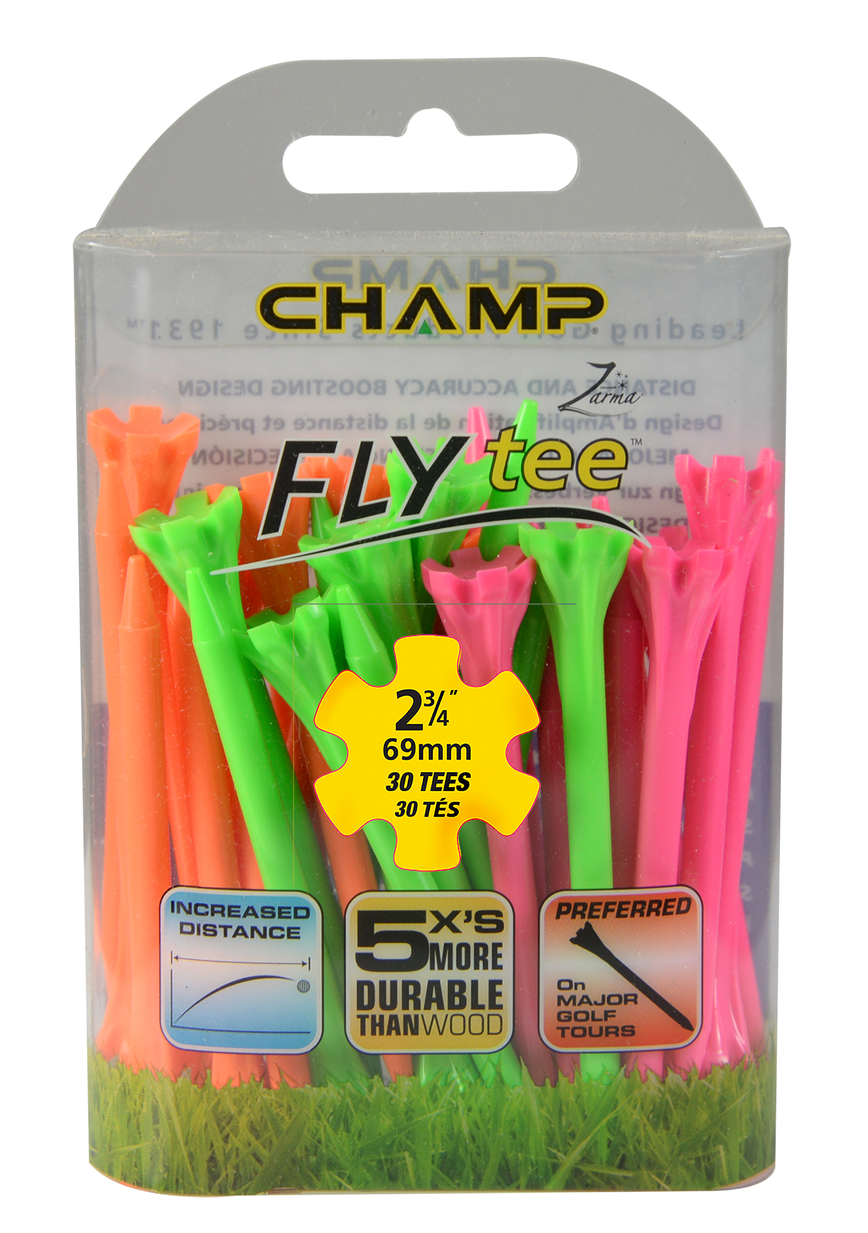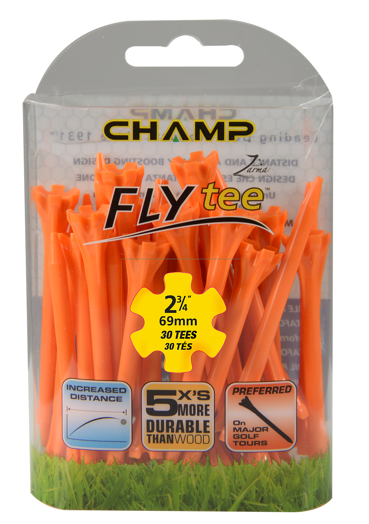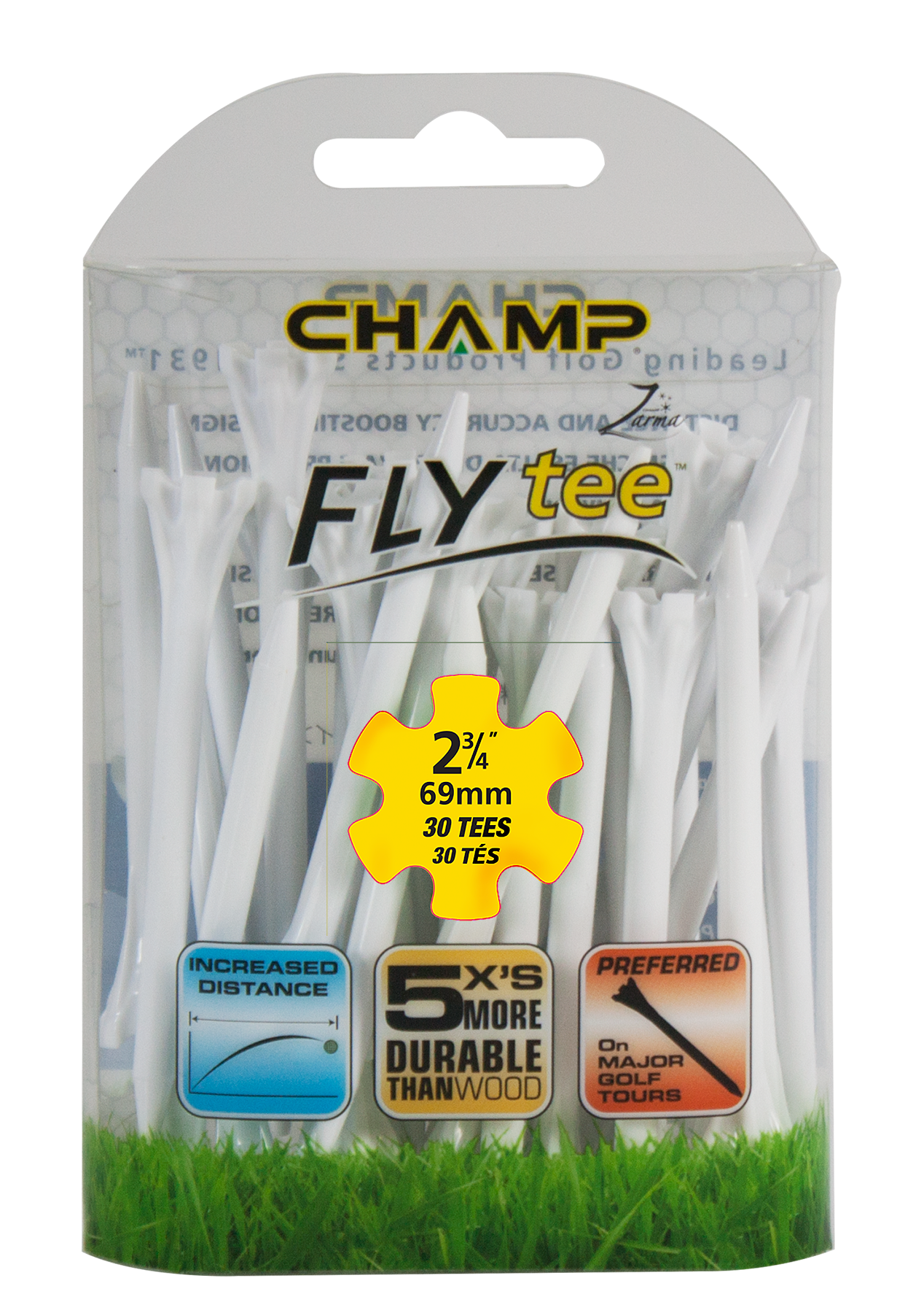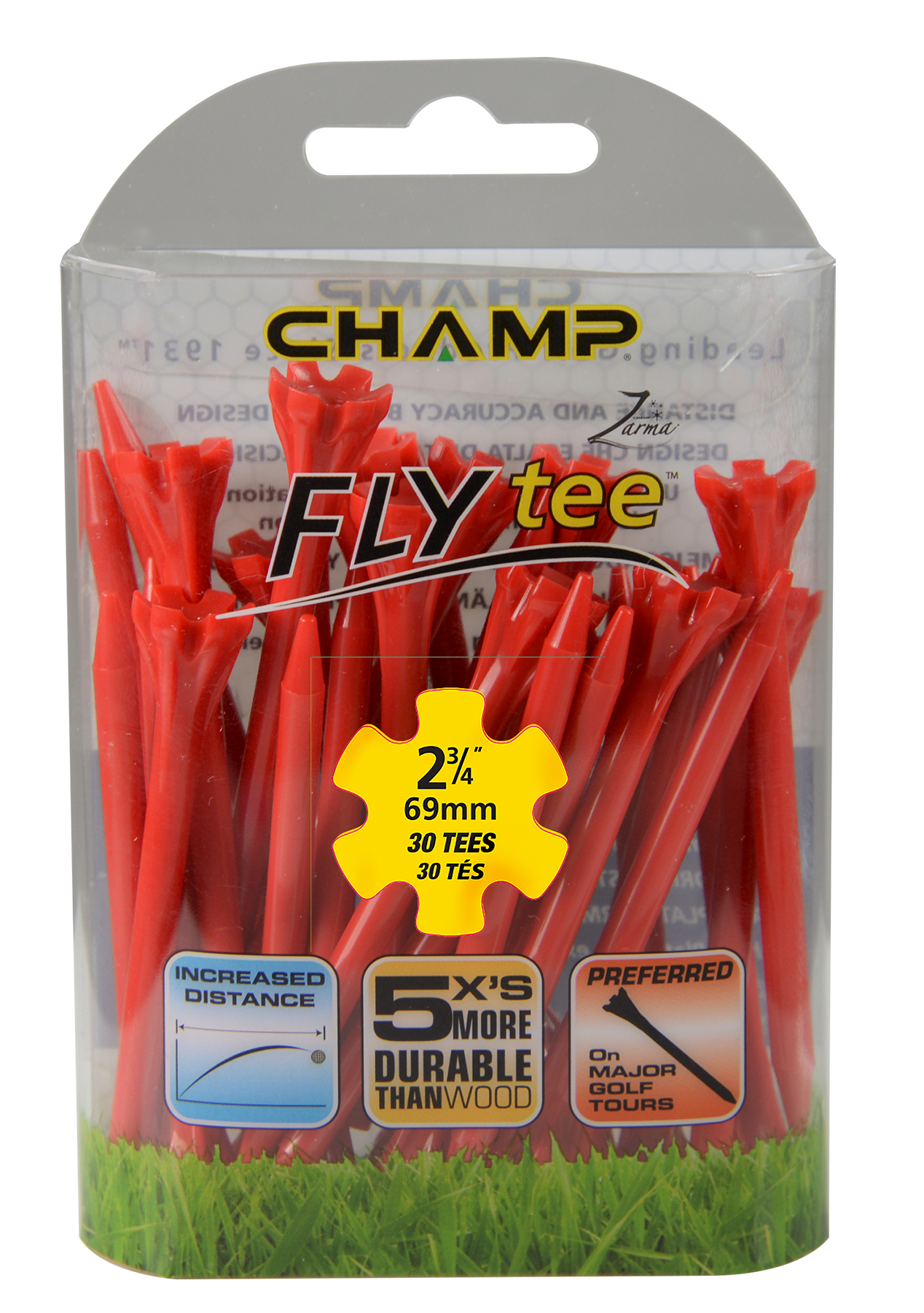 The Zarma FLYTee has a six prong head and a shallow cup design that reduces surface contact in order to promote additional distance and accuracy. Built-in reinforced ribs add durability and impact resistance.