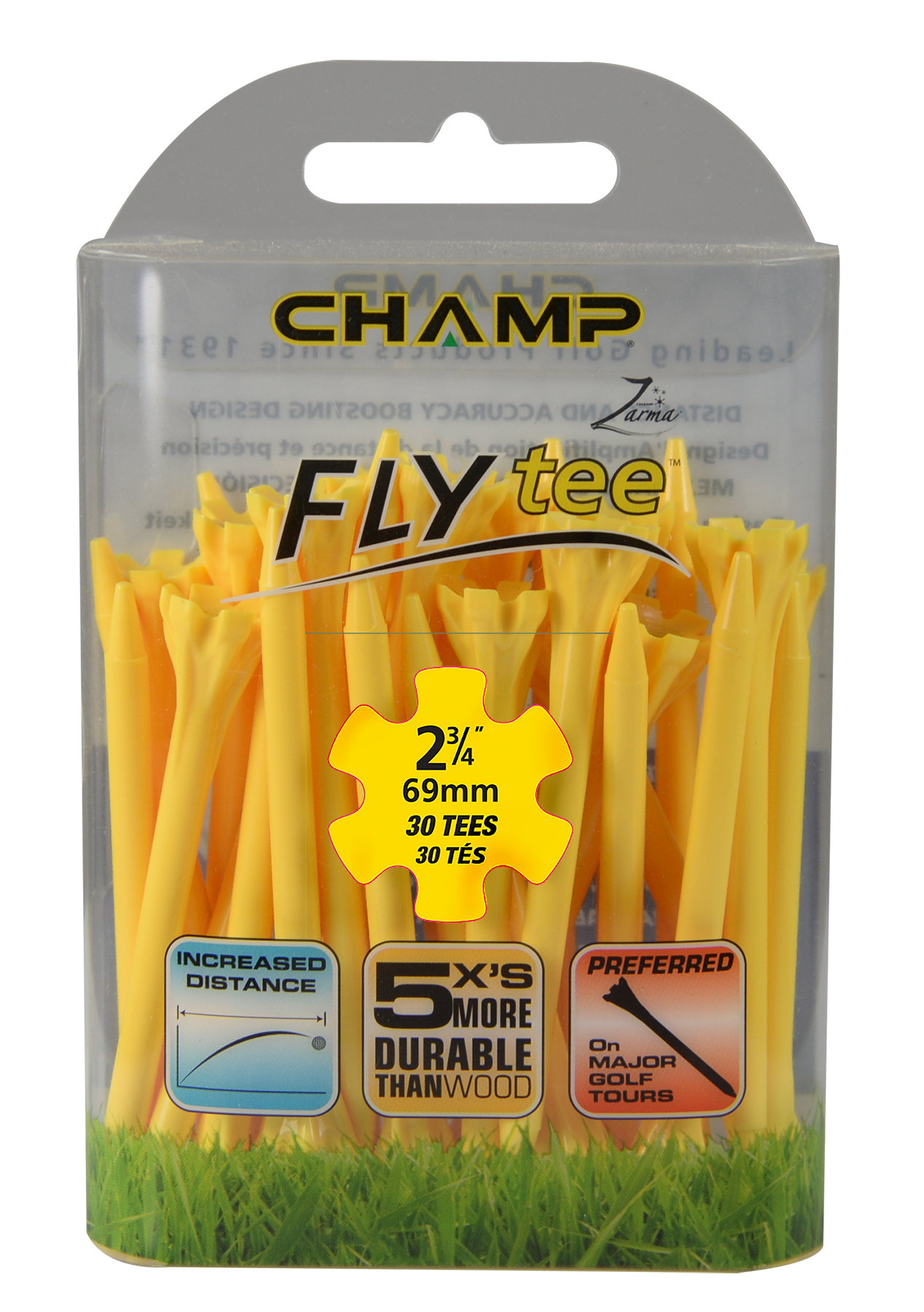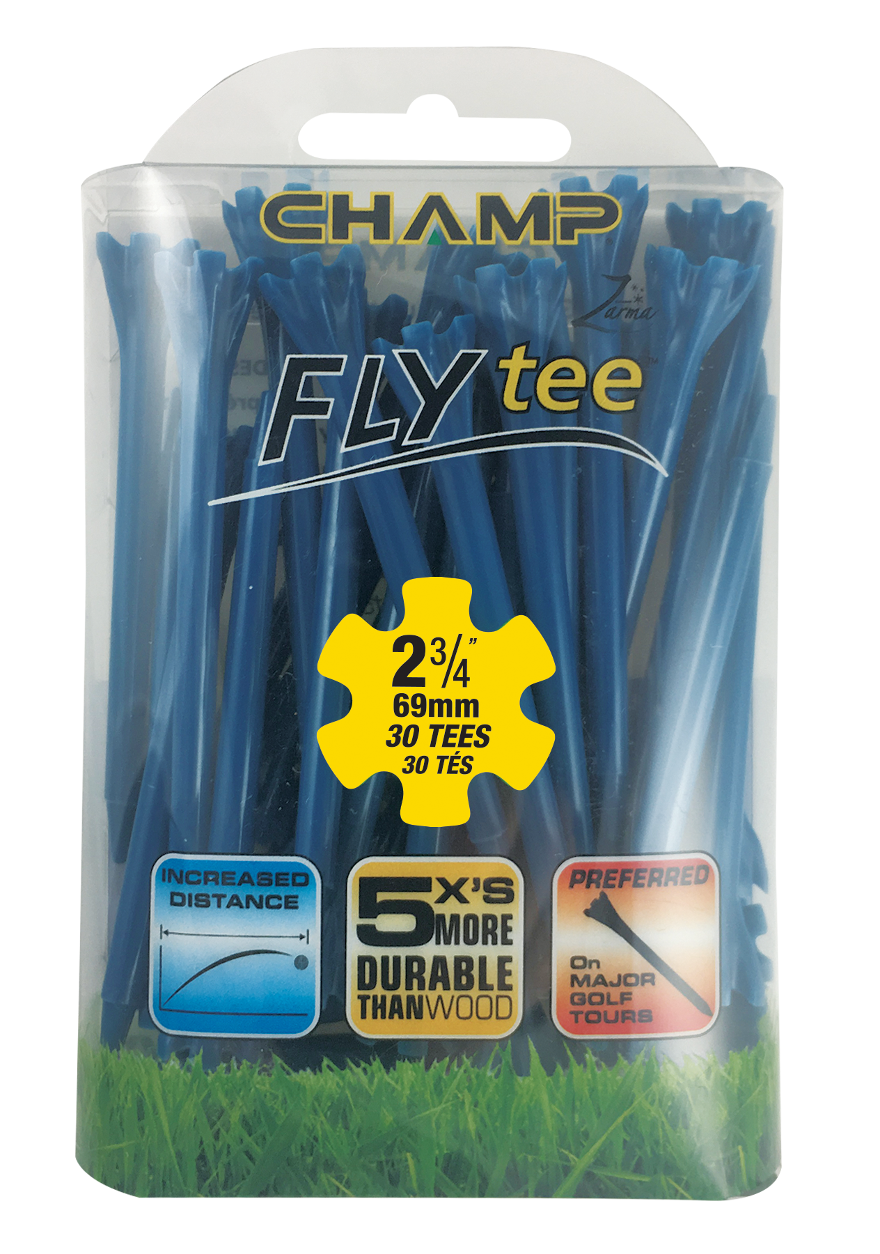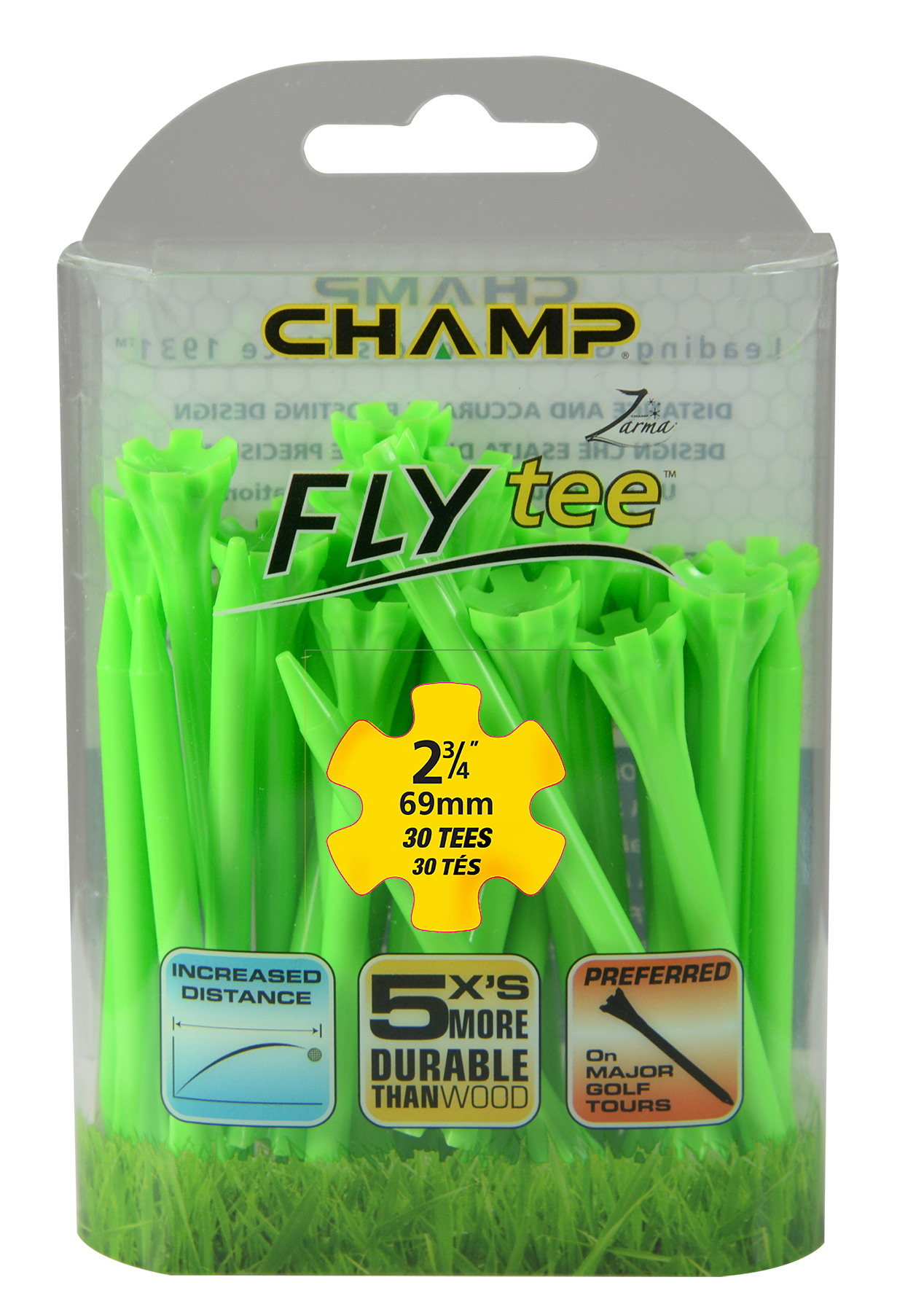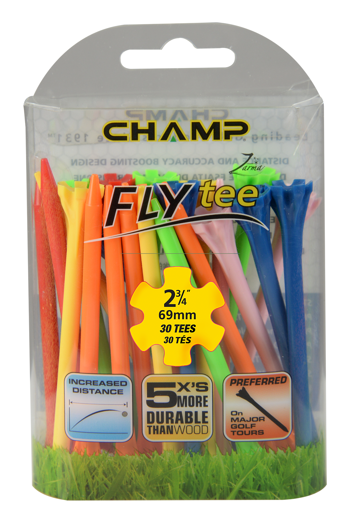 The Zarma FLYTee has a six prong head and a shallow cup design that reduces surface contact in order to promote additional distance and accuracy. Built-in reinforced ribs add durability and impact resistance.