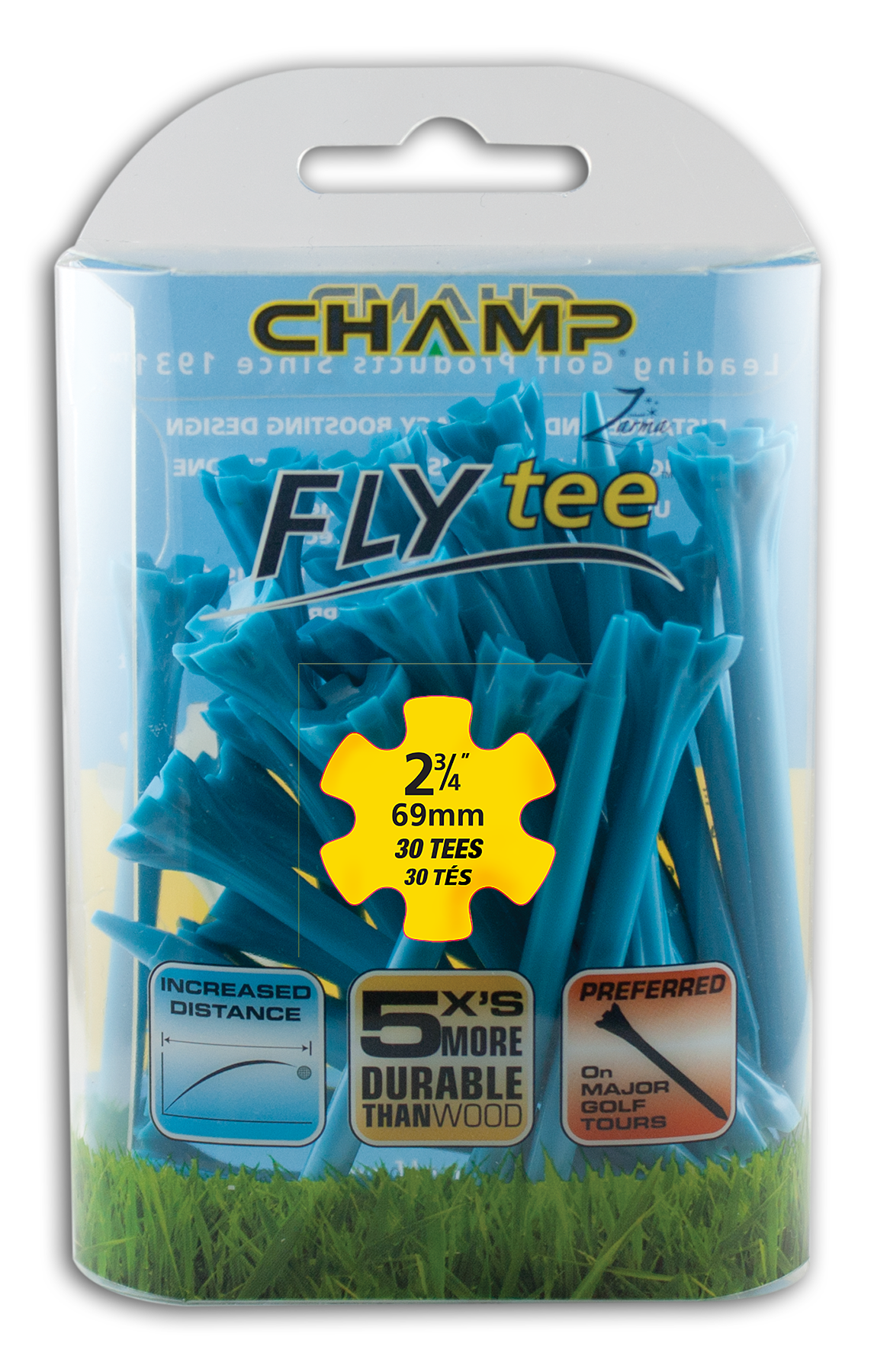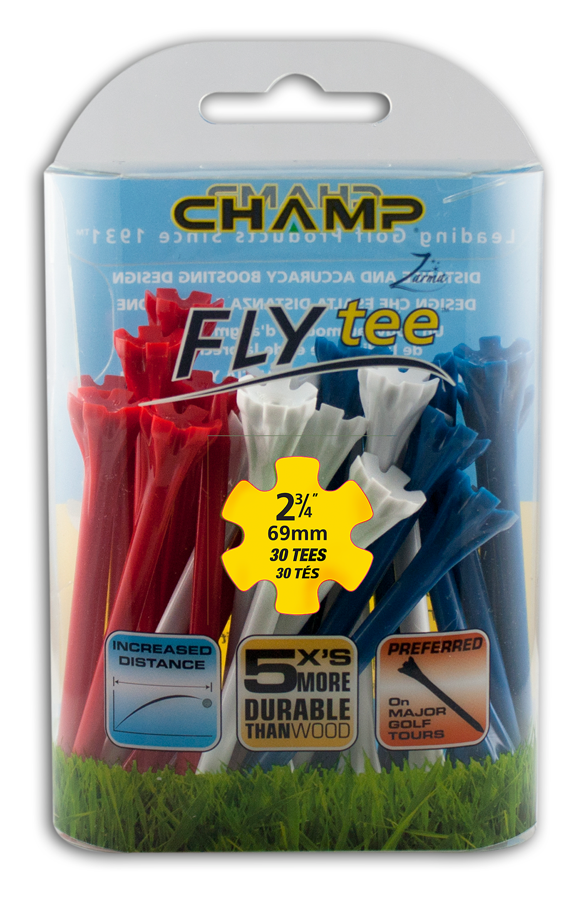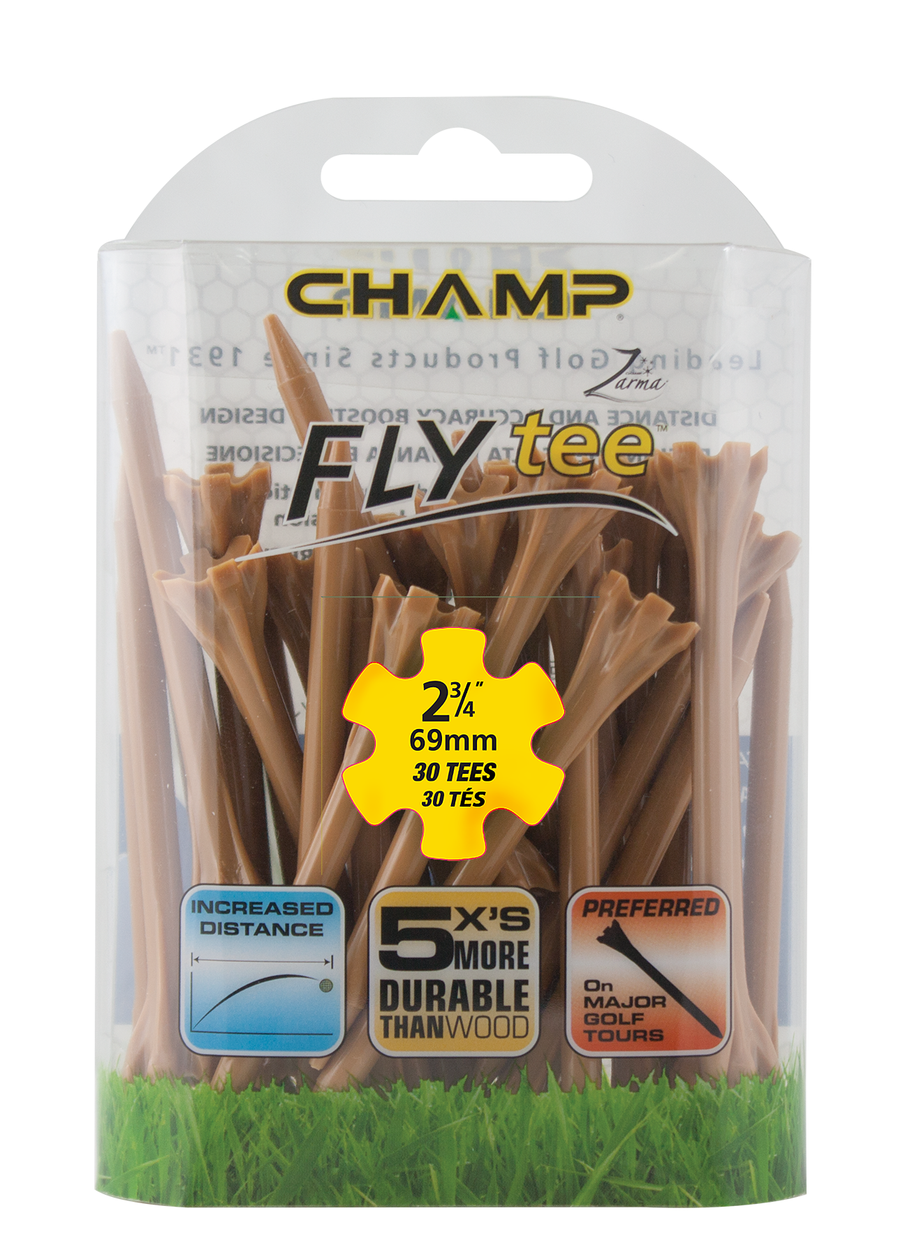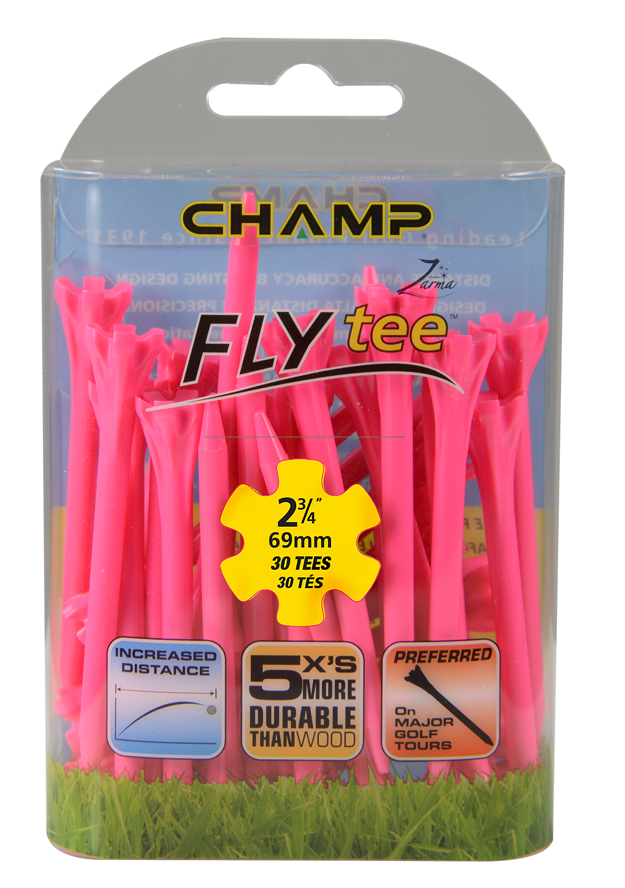 The Zarma FLYTee has a six prong head and a shallow cup design that reduces surface contact in order to promote additional distance and accuracy. Built-in reinforced ribs add durability and impact resistance.